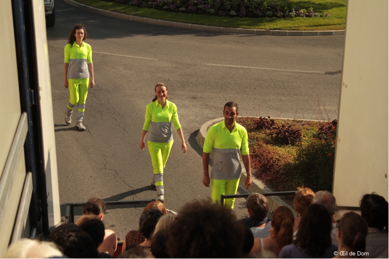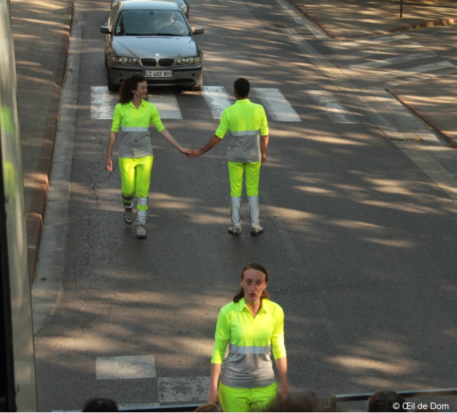 Le camion avance. Et les trois acteurs suivent en marchant. Ils parlent en s’adressant droit dans les yeux aux spectateurs. Derrière, la ville défile, long travelling arrière...