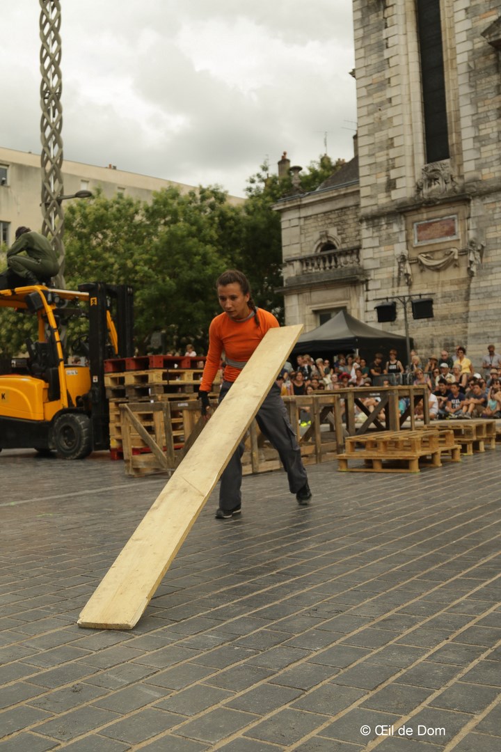 Dans ce système de société, les hommes doivent être aussi rentables et productifs que la machine, aussi efficaces. Les humains n’étant plus que des marchandises, ils se font également ranger par le chariot. Ils sont empilés, dés-empilés, déplacés, délocalisés. Le conducteur c’est El Konductor. Il ordonne, les autres doivent obéir à n’importe quel prix. Il manipule, asservit les autres, les range. Ce qui se joue dans l’espace de l’arène se propage peu à peu au public, on les intègre de plain-pied au système. Et…