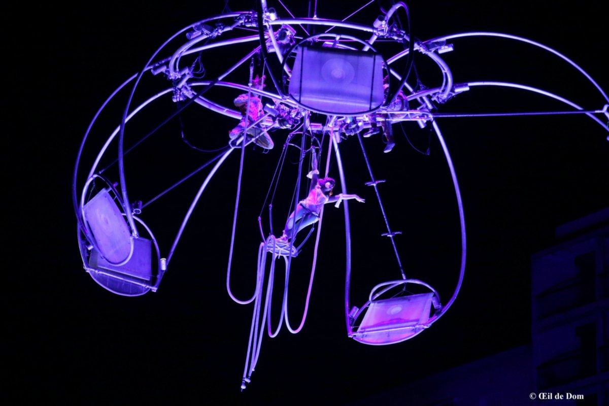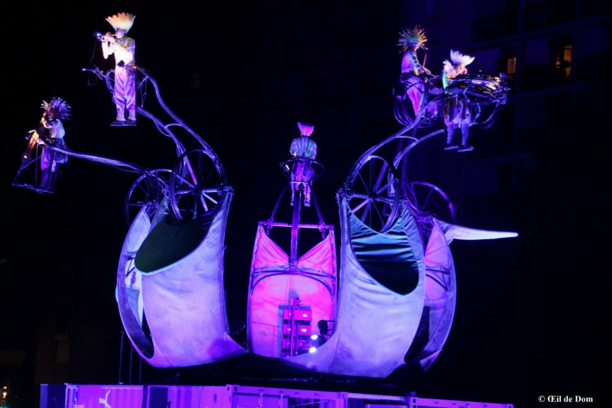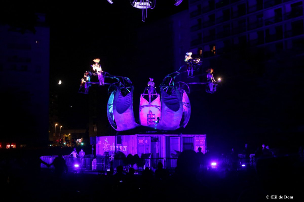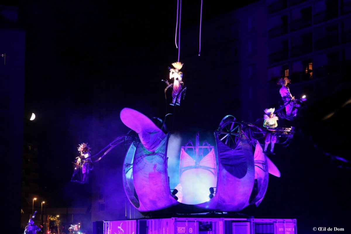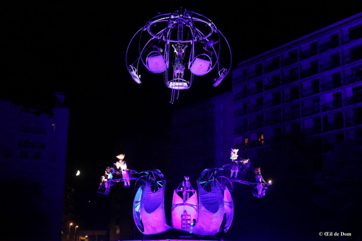 Un spectacle d’Art céleste, monumental et lumineux où musiques, images, prouesses corporelles et techniques envoleront les cœurs. Conçu comme une immersion dans la matière, le spectacle met en jeu une structure originale qui s’ouvre comme une boîte à musique géante. Manipulée par une grue télescopique, une étoile de l’air habitée de gargouilles-salamandres dialogue avec les musiciens-étamines d’une anémone articulée. Les parades lumineuses constituées d’une vingtaine de volontaires locaux, plongent la foule dans une narcose collective. Une écriture imaginée collectivement par l’équipe des nouveaux créateurs de la compagnie avec la complicité des anciens.